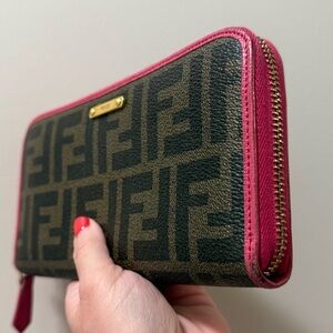 Elegant Fendi wallet with iconic logo pattern. Features a vibrant pink trim and gold accents. Fendi Brown and Pink Zucca Zippy Wallet. In good, pre-owned condition. See photos for closer look at condition.