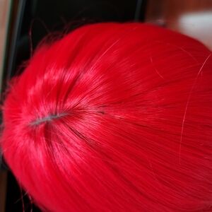 This striking candy apple red wig features a sleek, smooth texture with a high-shine finish. Its long, straight style offers a bold and eye-catching look, perfect for making a statement. The uniform color and synthetic fiber ensure a vibrant and consistent appearance.