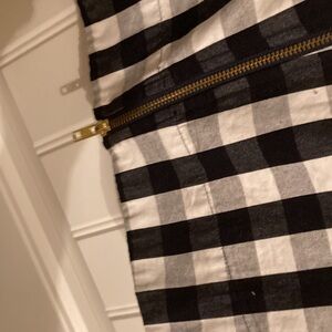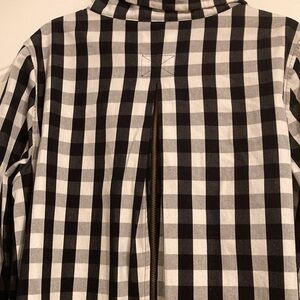 Checked black and white all year jacket. It has a little swing to it.pockets. A zipper in back if you want yo wear open to show your top from the back. It’s cute zipped or unzipped. Has black trim down front. No