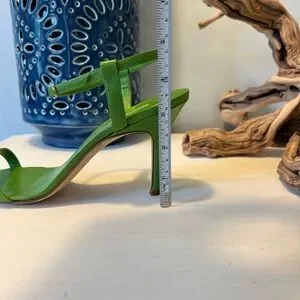These Manolo Blahnik heels in a striking green hue feature a minimalist design with two sleek straps, offering a sophisticated touch to any ensemble. The slim heel adds a touch of elegance, making them perfect for both casual outings and formal events. Crafted with attention to detail, these heels are a bold statement piece for any wardrobe.