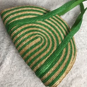Green and natural color woven straw handbag in half moon shape. Like new condition. No sign of previous use.