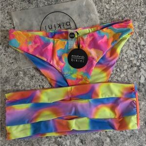 Adjustable straps, tie back, underwire top. Has a few fabric snags