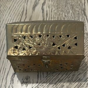 Vintage Elegant brass cricket/ incense box with intricate floral design. Perfect for storing small treasures. Made in India 5” wide x 3 1/2 inches deep to lid. Has handles on sides and closure tab.