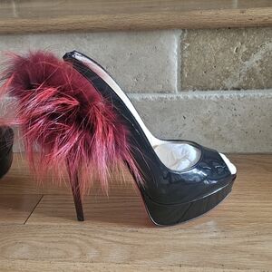 Worn less than 10 times. These shoes would be beautiful for a boudoir photo shoot. 150mm heel with platform. Main color is black, but the heel is a very dark wine color (see photos) which beautifully enhace the gorgeous red fur on the back of the shoe. Absolutely beautiful heels. Comes with red dust bags and additional heel taps. Retail was 1700.00
