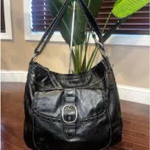 Elegant black leather shoulder bag. Features sturdy straps and silver-tone hardware. Perfect for everyday use.