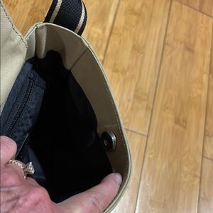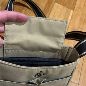 Stylish Ralph Lauren shoulder bag. Features a tan body with a black strap. Perfect for everyday use. There is a tiny mark on the bottom of the purse- please look at pictures.