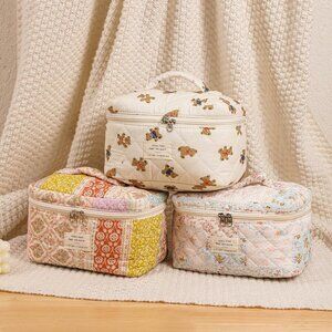 Large Quilted Makeup Bag for Women and Girls, Cute Coquette Floral Cotton Cosmet