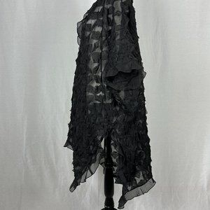 This black sheer cape offers a dramatic and elegant silhouette, perfect for layering over any outfit. Its lightweight, flowing fabric features a unique textured design, adding a touch of sophistication. Ideal for both casual and formal occasions, this cape is a versatile addition to your wardrobe.