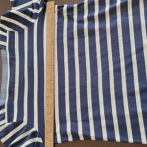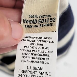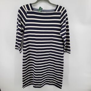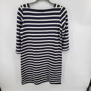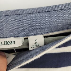 This L.L. Bean dress features a classic blue and white stripe pattern, perfect for casual or work settings. The 3/4 sleeves and bateau neckline add a touch of elegance to its sheath style, making it a versatile addition to any wardrobe.