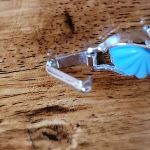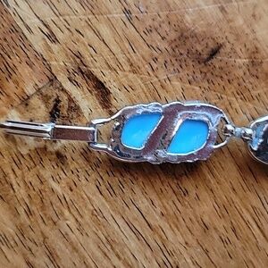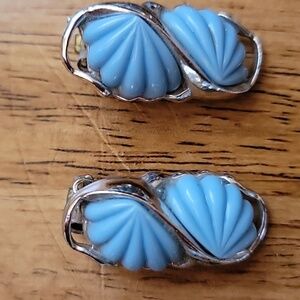 Vintage Thermoset Costume Fan or Shell Design 3 Piece Set In Baby Blue and Silver. No hazing or damage. Lovely 1960s coordinating set with earrings, necklace, and bracelet. 7" bracelet 16.5" necklace can be worn shorter as a choker necklace. Unmarked.