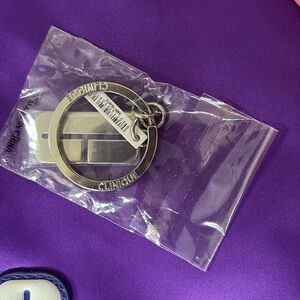 This Clinique tote bag showcases a striking purple hue, crafted from a glossy synthetic material, offering ample space for daily essentials. Accompanied by a charming pink pouch, this set is perfect for those who appreciate both style and functionality in their everyday carry. Plus a silver tone key chain.