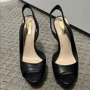 Crafted from smooth black leather, these Jessica Simpson heels feature a chic peep-toe design and a sleek slingback strap. The high stiletto heel and polished finish make them perfect for formal occasions, adding a touch of elegance to any outfit.