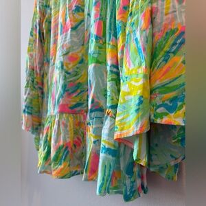 Vibrant Lilly Pulitzer tunic with tropical print. Features shades of blue, pink, yellow, and green. Lightweight, boho style babydoll top with empire waist. Feminine bell sleeves, ruffle layer hem, open v-neckline with tassels.