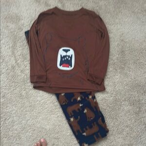 This pajama set from Carter's features a cozy brown long-sleeve top with a fun monster appliqué and matching navy blue pants adorned with a playful bear pattern. The soft material ensures comfort, making it perfect for a restful night's sleep.