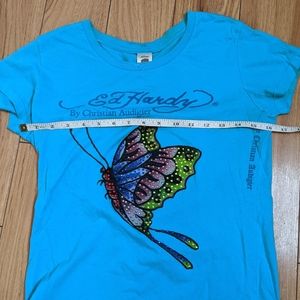 Vibrant blue tee with a colorful butterfly design. Short sleeves. Ed Hardy branding on front.