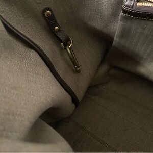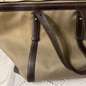 This is a classic Gerka travel bag made of 18 ounce cotton 12 brass hardware there is an interior removable pocket. The drop is 10 inches. There is a slight fading on the back of which is why this reduce price otherwise it’s an excellent condition. It’s a little marking on the interior there’s a fob and there’s a zip closure.