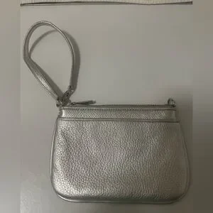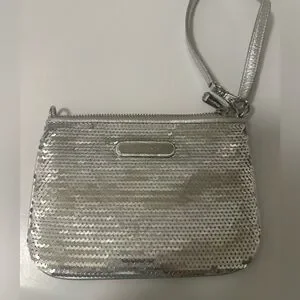 Elevate your evening ensemble with the Michael Kors Silver Clutch, featuring a dazzling metallic finish that catches the light beautifully. This sleek and compact wristlet is adorned with shimmering sequins, making it the perfect accessory for formal occasions. Its elegant design and luxurious texture ensure you stand out at any event.