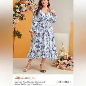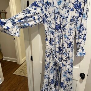 Elegant floral wrap dress in blue and white, perfect for any occasion. Features a flattering silhouette and stylish design.