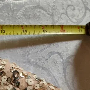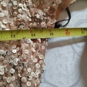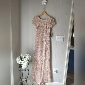 Make a graceful entrance in this stunning Adrianna Papell gown, perfect for the mother of the bride or any formal occasion. The champagne-colored sequins shimmer beautifully in the light, while the flattering silhouette gently hugs the body and flows into a soft train for an extra touch of elegance. Cap sleeves add subtle coverage, and the gown is fully lined for comfort.