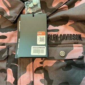 Eye-catching Harley-Davidson jacket with pink and black camo pattern. Features iconic branding.