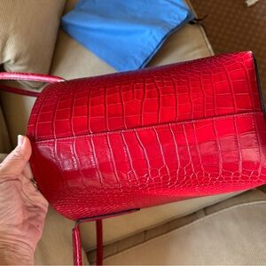 The Smythson East West Tote bag. In good condition. Only wear is on bottom corners. See photos. Beautiful embossed leather. Clean fabric lining with no stains rips or tears. Comes with original dust bag as well.