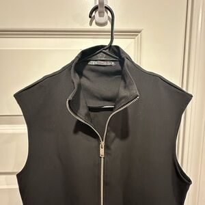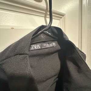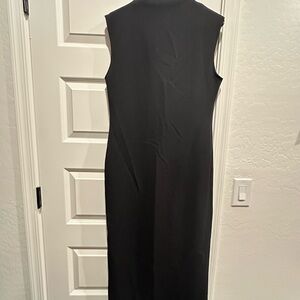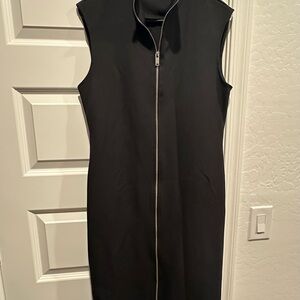 This elegant black sheath dress from Zara features a sleeveless design and a sophisticated mock neck, perfect for work or casual outings. The sleek silhouette is enhanced by a full-length silver zipper, adding a modern touch to its minimalist style. Crafted in a midi length, it offers a chic and versatile look for any occasion. Superb condition!