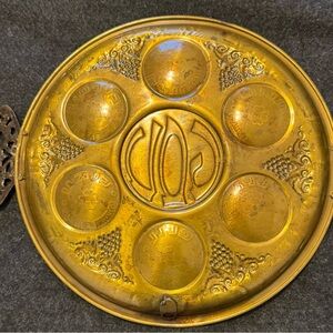 Beautiful Brass & Painted Jerusalem Passover Seder Plate Tray is about 9 1/2” diameter not including handles. The beautiful handles are imprinted with “Jerusalem “ at the bottom edge.