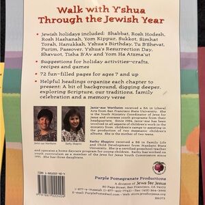 “Walk with Y’shua Through the Jewish Year” by Janie-sue Wertheim and Kathy Shapiro. Softcover, 72 pages for ages 7 and up and explains fifteen Jewish holidays from the perspective of Jesus (Y'shua) and the New Testament and Jewish traditions associated with each holiday, and offers creative ideas for celebration. Will help children understand the Jewish roots of their faith and provides a resource for families to learn about and celebrate the Jewish feasts. New condition.