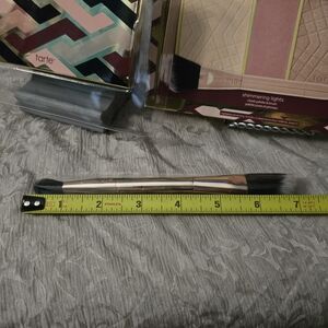 Tarte Shimmering Lights Cheek Palette & Brush set. This set includes a palette with three shades: a champagne pearl highlighter, a matte blush, and a glowing bronzer. It also comes with a double-ended makeup brush for easy application. The highlighter is designed to give the skin a "lit-from-within" glow, using microfine 3D pearls and pigments to reflect light and add depth. The formula is described as butter-soft, allowing for seamless blending. The set is vegan and cruelty-free, and formulated without parabens, mineral oil, phthalates, triclosan, sodium lauryl sulfate, and gluten. The palette offers buildable coverage, allowing for a soft glow or a more radiant look. The shades are designed to work well on different skin tones. Tarte Shimmering Lights Blush Palette & Brush Bundle Duo BNIB holiday gift set
