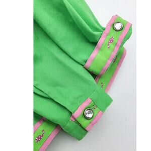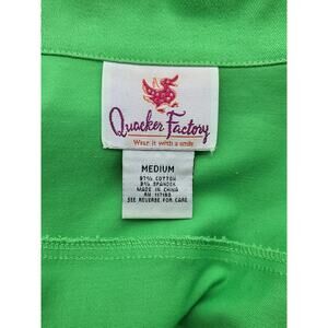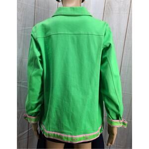 QUACKER FACTORY Women's M Lime Green Jean Jacket with Rhinestone Buttons and Pink Polka Dot Whales and Pink Ribbon Trim. Two flap front chest pockets and flip cuffs. Full front, sleeve cuffs and tab adjustment at hem has clear rhinestone faceted cut buttons. Color is closer to the 6th photo. Quality made 97% Cotton/3% Spandex. Machine wash. Excellent condition, like new. Measurements with flat lay in inches: