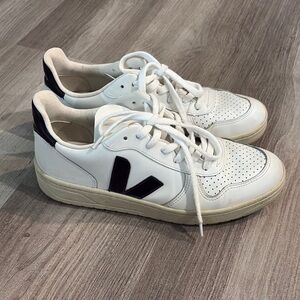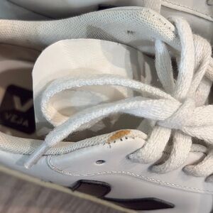 Classic Veja sneakers in white with black details. Ideal for everyday style. Small stain on right shoe by laces.