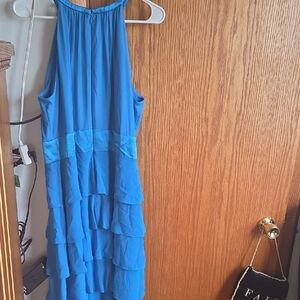 Elegant blue midi dress by Evan Picone. Features a tiered ruffle design. Sleeveless with a flowing silhouette. Perfect for cocktail parties, weddings, brunch or date nights
