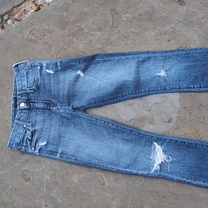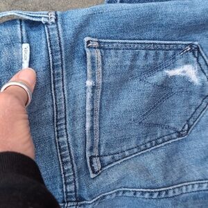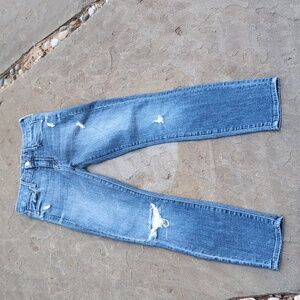 These are a classic 5 pocket Mother style. Distressing in the knees to add character but not too shredded. They look so cute on! Excellent condition!
