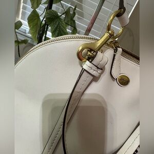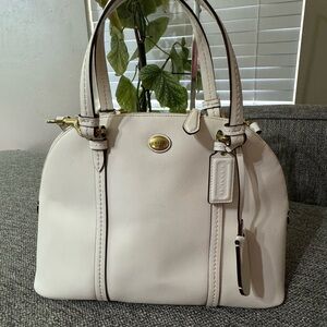 This Coach satchel in a refined cream color showcases a structured design with a sophisticated minimalist aesthetic. Crafted from textured leather, it features elegant gold-tone hardware that adds a touch of luxury. Ideal for any occasion, this bag combines timeless style with practical functionality.