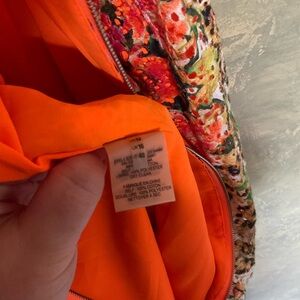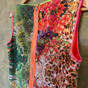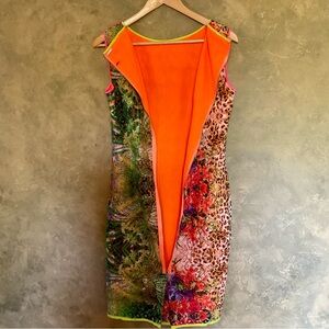 Beautiful vibrant and unique piece by designer Elie Tahari. This is the Claudia dress. Bright orange overlaid with woven eyelet abstract tropical leopard print fabric. Long exposed back zip. Neon yellow raw edge trim with neon pink trim at arms. Size 12.