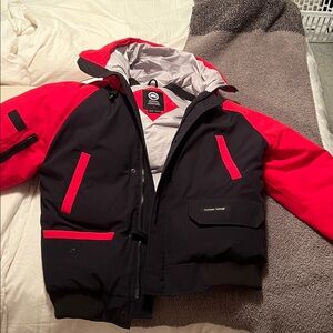 Sleek Bomber jacket with vibrant red sleeves. Signature Canada Goose style. Ideal for a bold look and chilly winters. Comes with original box and receipt!