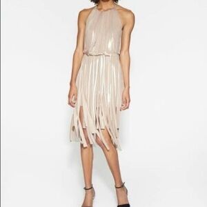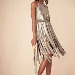 Halston Heritage Gold Metallic Carwash Dress. Swingy mini dress featuring a high modern halter neck and bare back in an all over shimmering metallic jersey fabric cut into multiple strips. Hidden side zip closure. Button closure on halter.