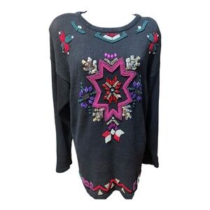 Soft Surroundings "Work of Heart" Embroidered Chambray Tunic in a light blue color. It features a round neck, long sleeves, and intricate embroidery around the neckline and shoulders. The tunic has a relaxed fit and is made of chambray fabric. Size XL PP 22 L 31