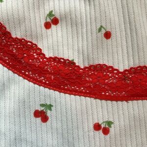 Stylish white top with red lace trim. Features delicate cherry print.