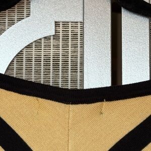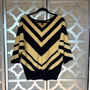 Elevate your style with this chic black and gold striped sweater. Perfect for any occasion, this sweater offers both comfort and elegance.