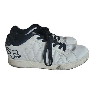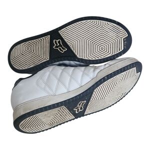 Men’s Fox Racing low-top sneakers in size 9.5. These classic skate-style shoes feature a white quilted leather upper with black laces and the signature Fox Head logo. Designed for street, BMX, or casual moto-inspired fashion with a cushioned insole and durable rubber sole.