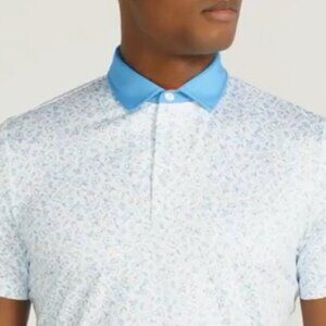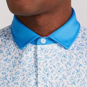This polo is white with an abstract blue floral pattern. There is also a 3-button placket front closure. A combination of the softest and stretchiest polyester/spandex blend. Lightweight fabric which keeps you dry and comfortable during hot days! Brand New!