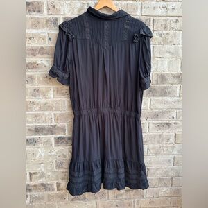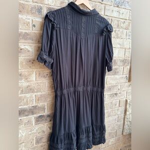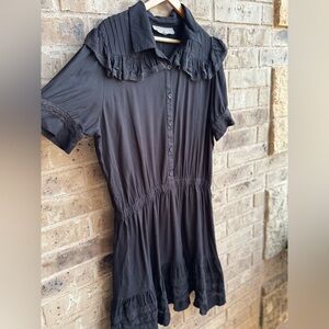 Stylish black mini dress with ruffled details. Features a button-down front. Perfect for any occasion.