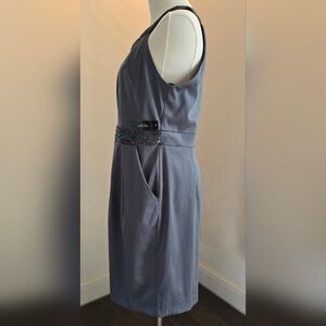 Key Info: dress, sleeveless, halter, gray, blue-gray, Bisou Bisou, satin, Sz. 8, pockets