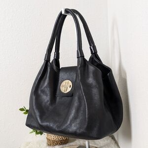 Elegant black leather handbag. Features a stylish gold clasp. Perfect for any occasion.