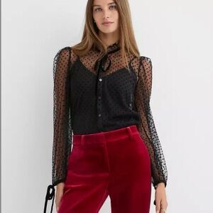 Chic plaid blouse with ruffle collar. Features a stylish bow at the back. Perfect for casual or dressy occasions.