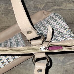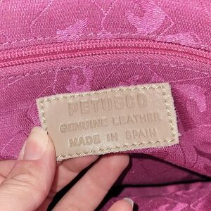 Petusco Leather Shoulder Bag Made in Spain and, in great pre-owned condition and, smoke-free home! This stylish shoulder bag features a sophisticated tan and white color palette with intricate woven detailing. Its structured design and spacious interior make it perfect for everyday use, combining elegance with practicality.