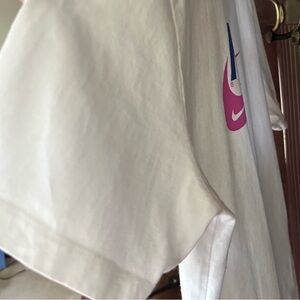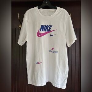 Authentic classic Nike Sportswear graphic t-shirt in a bold white with retro style pink and purple Swoosh logo graphics across the front, sleeve, and lower torso. Features layered logo variations. Ultra-soft 100% cotton with a ribbed crew neckline and printed interior tag for maximum comfort. Made in Egypt.