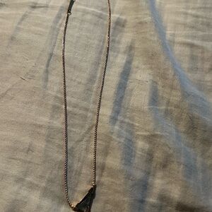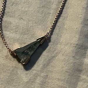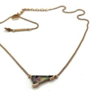 This elegant necklace by Kendra Scott showcases a sleek gold chain paired with a captivating geometric pendant. The pendant features an iridescent material that shimmers with hints of purple and green, adding a modern touch to its minimalist design. An adjustable clasp ensures a comfortable and versatile fit for any occasion.
