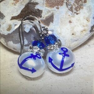 Stylish earrings featuring nautical anchor design. Blue and white colors with sparkling accents.